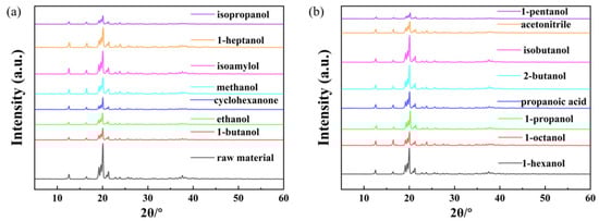 X-ray powder diffraction patterns of α-LM in different solvents: (a) the raw material, 1-butanol, ethanol, cyclohexanone, methanol, isoamylol, 1-heptanol, isopropanol; (b) 1-hexanol, 1-octanol, 1-propanol, propanoic acid, 2-butanol, isobutanol, acetonitrile, 1-pentanol.