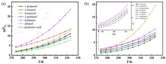 Solubility of α-LM in 15 solvents: (a) (ET(30) ≥ 49.0): 1-propanol, 1-butanol, isoamylol, 1-pentanol, methanol, ethanol, and propionic acid; (b) (ET(30) < 49.0): 1-hexanol, acetonitrile, cyclohexanone, 2-butanol, 1-heptanol, 1-octanol, isopropanol, and isobutanol. The trend lines were fitted with the Apelblat equation.