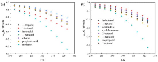 ΔdisG of α-LM in 15 solvents: (a) (ET(30) ≥ 49.0): 1-propanol, 1-butanol, isoamylol, 1-pentanol, methanol, ethanol, and propionic acid; (b) (ET(30) < 49.0): 1-hexanol, acetonitrile, cyclohexanone, 2-butanol, 1-heptanol, 1-octanol, isopropanol, and isobutanol.