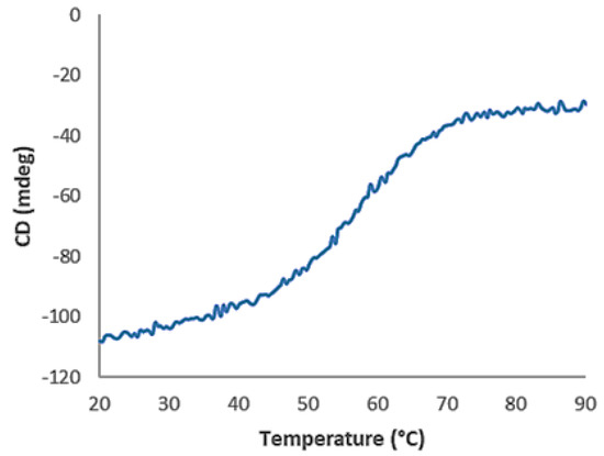 The CD (in mdeg) is plotted as a function of temperature. The Tm value was determined to 55 °C at maximum slope.