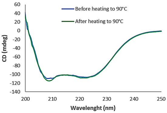 Affibody molecule AC12-GGGC, diluted to 0.5 mg/mL in PBS (Corning, Glendale, AZ, USA) supplemented with 2 mM EDTA (Corning, Glendale, AZ, USA), was characterized by Circular Dichroism (Jasco J-810 spectropolarimeter, Jasco Scandinavia AB, Mölndal, Sweden). A Circular Dichroism (CD) spectrum at 250–195 nm was performed at 20 °C. A new CD spectrum was performed after a variable temperature measurement (VTM) at 221 nm, 20 °C to 90 °C, to analyse refolding of AC12-GGGC after thermal denaturation.