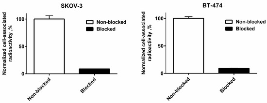 In vitro binding specificity of [99mTc]Tc-AC12-GGGC on SKOV-3 and BT-474 cell lines. For the pre-saturation of B7-H3, a 200-fold molar excess of a non-labelled Affibody molecule was added before adding the labelled conjugate. Data are normalized to the average value of cell-associated radioactivity for non-blocked cells for each cell line. The data are presented as an average value from three samples ± SD.