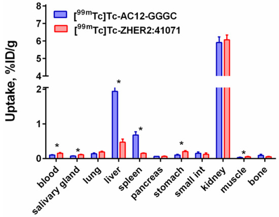 Comparative biodistribution of [99mTc]Tc-AC12-GGGC and [99mTc]Tc-ZHER2:41071 Affibody molecules in different organs and tissues of female NMRI mice at 4 h after injection. 3 µg of labelled Affibody molecule (60 kBq, 100 µL in PBS) was injected into the tail vein. Data are expressed as %ID/g and are averages from four mice ± SD. The significance indicator (*) corresponds to p < 0.05 in.