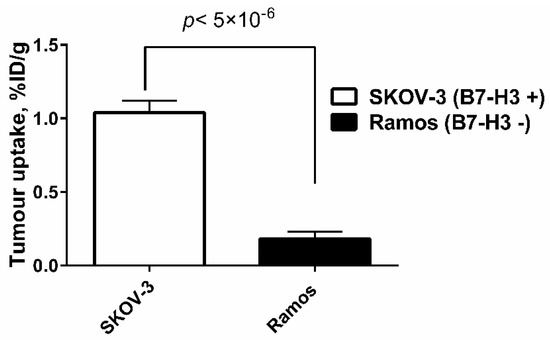 Experiments in nude mice-bearing human cancer xenografts demonstrated that the uptake of [99mTc]Tc-AC12-GGGC in B7-H3-positive SKOV-3 xenografts was significantly (p < 5 × 10−6) higher than in B7-H3-negative Ramos xenografts 4 h after injection (Figure 8), which supports that the tumour accumulation was B7-H3-specific in vivo.