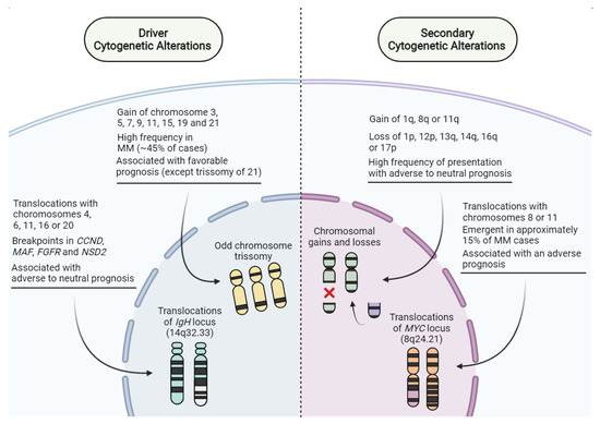 Regarding genetic alterations, MM is known to present a great heterogeneity; however, mutations that could be considered precursors of the disease are now well known, and these genetic alterations can be used as a prognostic factor. An example of this would be mutations in the IgH gene locus, responsible for producing the heavy chains of immunoglobulins, which are considered to be early precursor mutations [3,29,30]. Chromosomal translocations involving IgH and other genes such as Nuclear Receptor Binding SET Domain Protein (NSD2), Fibroblast Growth Factor Receptor 3 (FGFR3), Cyclin D3 (CCND3), Cyclin D1 (CCND1), MAF bZIP Transcription Factor (MAF), and MAF bZIP Transcription Factor B (MAFB), resulting in the translocations t(4;14), t(6;14), t(11;14), t(14;16), and t(14;20), respectively, are also an important clinical finding, as they deregulate checkpoints of the cell cycle due to increased gene transcription under the activity of IgH transcription enhancer (Figure 1) [14,31,32,33,34].