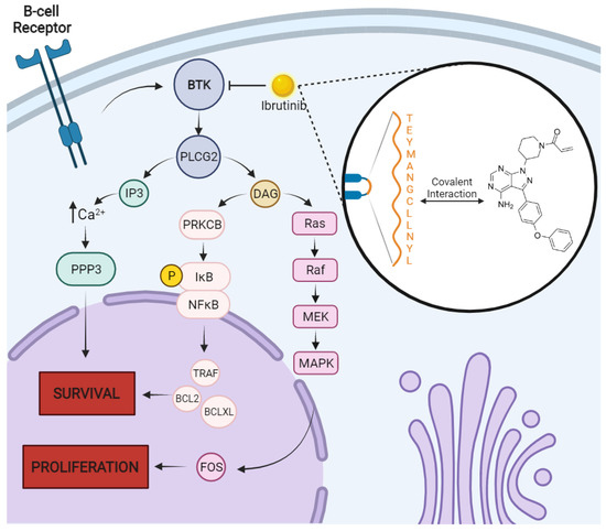 BTK inhibitors (BTKi) are one of the most popular and advanced approaches to targeting the BCR pathway. In addition to having revolutionized the treatment of B-lymphocyte malignancy, they also have a high level of efficacy in relation to chronic lymphocytic leukemia (CLL) patients, especially those with high-risk mutations [102,103]. Among these inhibitors, Ibrutinib stands out, already showing robust and durable efficacy in the treatment of refractory CLL and being one of the first inhibitors of the pathway to be approved by the FDA [104,105].
