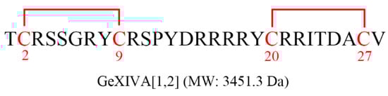 Amino acid sequence of GeXIVA[1,2]. GeXIVA[1,2] is a 28-amino acid peptide. It includes 4 cysteines with disulfide bonds between Cys2–Cys9 and Cys20–Cys27. Red lines indicate the disulfide bonds.