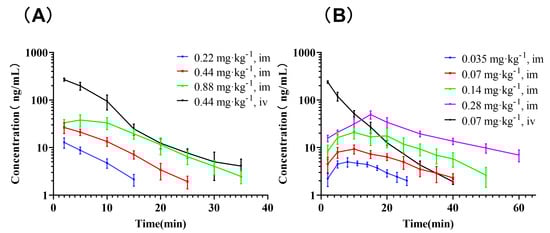 Given the short half-life of GeXIVA[1,2], the PK data were derived from five experiments on six beagle dogs (three male and three female dogs). Dogs received a single IM dose of 0.035, 0.07, 0.14, or 0.28 mg·kg−1 GeXIVA[1,2] and an IV dose of 0.07 mg·kg−1 each time, and at least one-week intervals were allowed between each dose. Serial blood samples were collected according to Table 1.