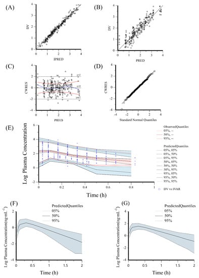 GoF plots were used to evaluate the adequacy of fitting as follows: (a) observed (DV) versus population predicted concentrations (PRED); (b) DV versus individual predicted concentrations (IPRED); (c) conditional weighted residuals (CWRES) versus PRED; and (d) quantile-quantile plot of components of CWRES.