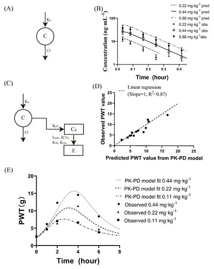 The observed PWT values and the predicted PWT values were matched well (Figure 4E). The ratios of the predicted-to-observed PWT values were within 0.69–1.22-fold range, and the AUC of the effect was within 1.03–1.11-fold range for all three doses, indicating that the PK-PD model could adequately describe the PK-PD relationships (Figure 4E and Table S2). The linear regression of the predicted PWT values from the PK-PD models plotted against the observed experimental data showed good correlation between the observed and predicted data (Figure 4D).