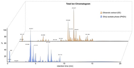 Total ion chromatogram (TIC) in the negative ionization mode of the ethanolic extract (EE), and ethyl acetate phase (PhEA).
