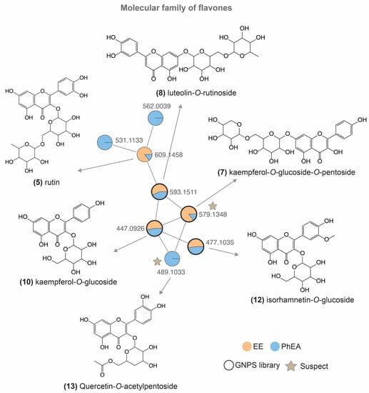 The molecular networking created with EE and PhEA showed 224 parent ions after removing the blank. Seven compounds (6, 7, 8, 10, 12, 23 and 32) including isomers were annotated based on MS2 data available in the GNPS spectral libraries. A family of flavones was reported, and the structure of the compounds is shown in Figure 2.