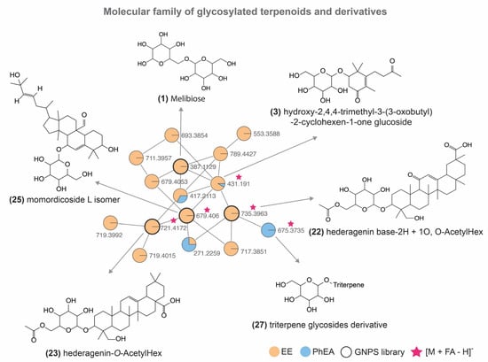 A molecular family of glycosylated terpene derivatives (Figure 3) was detected in the EE. The ion of m/z 385.1856 is referent from peak 3, identified as hydroxy-2,4,4-trimethyl-3-(3-oxobutyl)-2-cyclohexen-1-one glucoside, and the pathway of fragmentation has been shown in previous reports [50]. The fragmentation of the ion m/z 385 generated an ion at m/z 223, which refers to a neutral loss of a glycoside [(M − H) − 162]−. A loss of H2O indicates the ion m/z 205 followed by losses C2H2O and C3H8 suggesting the ions of m/z 163 [(M − H) − 42]− and 119 [(M − H) − 42 − 44]−, respectively. Lastly, m/z 113 is explained by ring fission and loss of C7H10O [(M − H) − 110]−. This compound is included in the monoterpenes class and derivatives already reported in the literature from the Cucurbitaceae family [51].