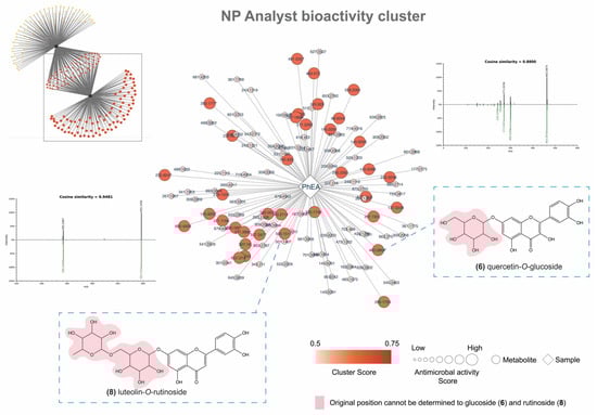 Community network. PhEA illustrated as square white node. Two examples of predicted bioactive flavones (6,8). The color of metabolite nodes is defined by cluster score (0.5–0.75). The size corresponds to the activity score (normalized data).