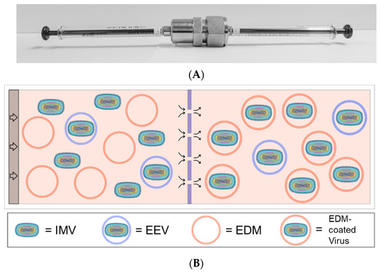 Encapsulation of oVV was achieved by fine membrane extrusion as has been previously described by others [28,29]. Briefly, we sanitized an extrusion apparatus consisting of two glass syringes, a membrane support housing (Avanti, Alabaster, AL, USA), and 1.0 µm-pore polycarbonate membrane (Whatman, Maidstone, UK) by soaking each component in 70% isopropanol followed by a rinse with sterile DI water (Figure 1A). The pre-extrusion volume contains oVV obtained from the manufacturers (“oVV”) in EDM at approximately a 1:100 mass ratio based on the whole protein content. This mix of EDM plus oVV was then processed by repeatedly passing back and forth through the membrane, propelled by syringe pumps. The process is illustrated in the schematics shown in Figure 1B and 1C. Coated oVV (“EDM-coated oVV”) were deposited in sterile 1.5 mL tubes and used immediately. We use qPCR, as detailed in the protocol below, to quantify the number of copies of oVV DNA and EDM-coated oVV DNA, to ensure that no oVV is lost during the encapsulation process.