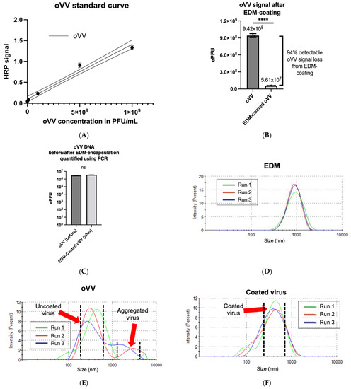 (A) oVV standard curve generated via ELISA assay. Dotted lines above and below the solid line denote a 95% confidence in the values of the assay. (B) Detectable oVV signal before and after processing with EDM, interpolated from the ELISA standard curve. Results are presented as mean ± SD, n = 3. Data were analyzed with ANOVA with Tukey pairwise comparison test. The level of statistical significance was set at probability level **** p < 0.0001. (C) oVV DNA before and after extrusion as quantified using PCR. Results are presented as mean ± SD, n = 3. Data were analyzed with ANOVA with Tukey pairwise comparison test. The level of statistical significance was set at probability level ns p ≥ 0.05. (D–F) Particle size measurements of the (D) EDM, (E) oVV, and (F) EDM-coated oVV, measured across 3 dynamic light scattering runs.