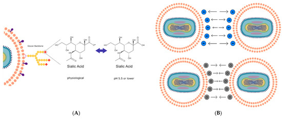 (A) Schematic of the basis of our model: protonation of sialic acid residues at any pH lower than the physiological pH neutralizes the strongly negative charges. (B) Diagram showing lowering the electrostatic repulsion between the particles via charge neutralization. DLVO theory predicts a threshold where the attractive Van der Waals forces will bring particles together in aggregation.