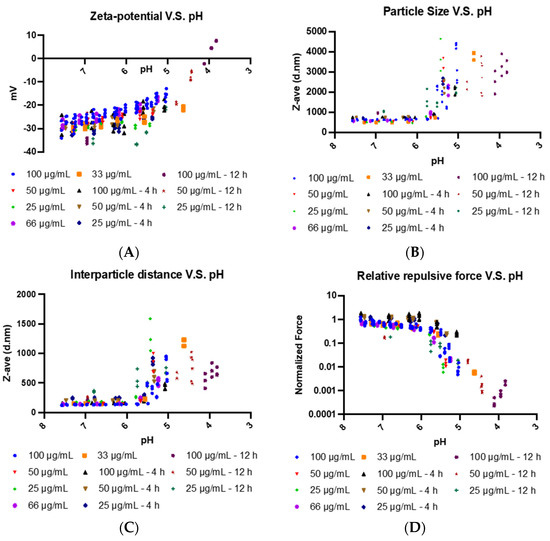 As the pH decreases and the environment becomes more acidic: (A) zeta-potential increases; (B) particle size increases at pH < 6; (C) interparticle distance increases at pH < 6; and (D) relative repulsive forces slowly decrease at pH < 6 and decrease much faster at pH < 5.