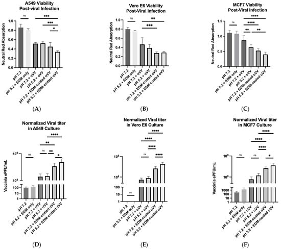 (A–C) Neutral red-based viability assay results of various cancer cell lines when oVV/EDM-coated oVV were used to infect at different acidities, along with their accompanying negative controls and vehicle/pH controls; (D–F) intracellular viral concentrations at 24 hours post-infection of various cancer cell lines by oVV/EDM-coated oVV at different acidities along with their accompanying vehicle/negative controls. All results are presented as mean ± SD, n = 6. Data were analyzed with ANOVA with Tukey pairwise comparison test. The level of statistical significance was set at probability level ns p ≥ 0.05, * p < 0.05, ** p < 0.01, *** p < 0.001, **** p < 0.0001.