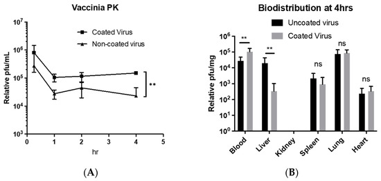 (A) Acute pharmacokinetics of an intravenously administered dose of coated and uncoated oncolytic vaccinia virus. (B) Biodistribution of the coated and uncoated oncolytic vaccinia viruses in blood and in several organs 4 hours post-intravenous administration. The results are presented as mean ± SD, n = 6. Data were analyzed with Student’s t-test. The level of statistical significance was set at probability level ns p ≥ 0.05, ** p < 0.01.