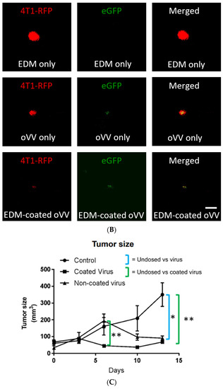 To measure the translation of this increase in infectivity into a physiologically relevant in vivo model, we chose (1) the MDA-MB-231 breast cancer xenograft model; and (2) to administer the virus intratumorally. Breast cancer was chosen as studies have shown that it can develop acidic tumors [40], and the NOG mice was used as it is the most immune-compromised mouse model that is currently being studied. These NOG mice have not only lost their adaptive immunity but also have reduced leukocytes and impaired phagocytosis mechanisms. This model was specifically used for two reasons: (1) to reduce the amount of immune clearance of the oVV; and (2) to allow us to deliver the EDM-coated oVV using human extracted membranes. Studies with blood transfusions into various mouse models have shown that the NOG mice would clear our human erythrocytes very slowly, which is most conducive for our experiment. In order to eliminate the differences between the tropism of oVV and EDM-coated oVV that may arise because of the differences in blood virus concentration, and homing to the tumor, we opted to directly inject the viruses into the tumor. Our PCR data from Figure 2C show that both samples contain approximately the same number of viruses by genome copy, so we can be sure that tumors across groups receive the same viral dose. This allows us to remove other influences and study, in isolation, the differences in infectivity of oVV and EDM-coated oVV.