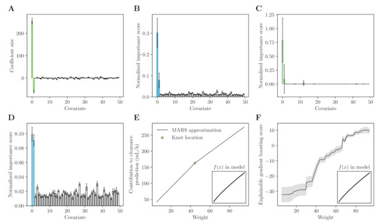 We have performed a simple simulation study (see Appendix A for implementation details) to showcase the use of some of the previously mentioned methods for covariate selection. Each method was fit to predict individual clearance estimates based on covariate data containing two true covariates and 48 noise covariates. In Figure 1, we depict the measures of covariate importance as determined by means of LASSO, MARS, random forest, or explainable gradient boosting. Each method has correctly identified the two true covariates as important. In addition, we have depicted the approximation of the covariate effect by MARS and explainable gradient boosting (see Figure 1E,F).