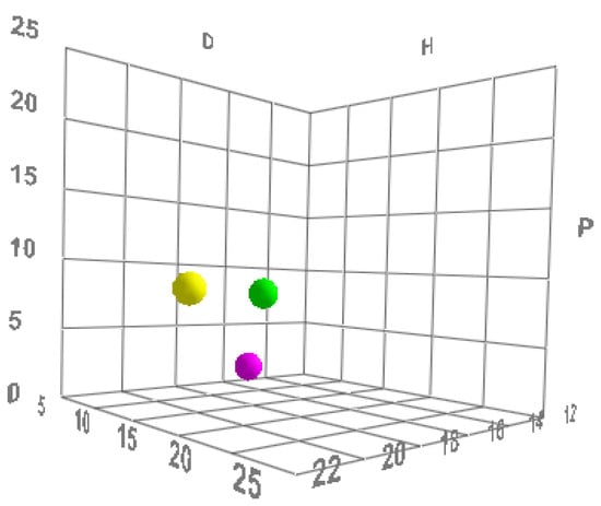 Illustrative representation of three different elements (formulation, active and skin) that are placed, according to their HSPs, in Hansen’s space. Image of a graph created by Formulating for Efficacy® Software, using the three-dimensional Hansen representation. D = energy from dispersion forces; P = energy from dipolar intermolecular force; H = energy from hydrogen bonds. Reprinted and adapted with permissions from [9,10].
