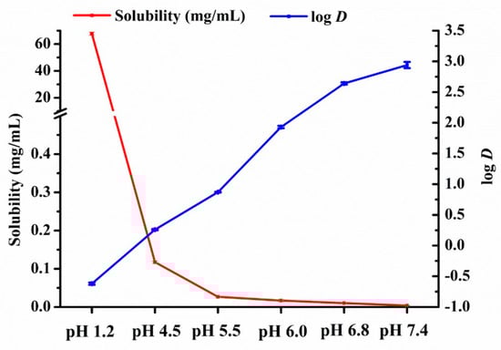 The equilibrium solubility and apparent n–octanol/water partition coefficient of a drug in the GI tract are the key parameters that affect drug absorption. As shown in Figure 2, the maximum solubility was 67.7 ± 1.2 mg/mL in pH 1.2 SGF. Sharply decreased solubility of nintedanib was observed when the pH value of the solvent ranged from 1.2 to 5.5. As the pH increased from 5.5 to 7.4, the drug solubility gradually decreased to 26.8 ± 1.6 µg/mL and 3.8 ± 0.2 µg/mL, respectively. The solubility changes with pH value indicated the pH-dependent solubility of nintedanib. On the contrary, the apparent n–octanol/water partition coefficient (log D = 2.64 ± 0.02) in the pH 6.8 medium was higher than that (log D = −0.62 ± 0.02) in the pH 1.2 medium, indicating that nintedanib was more lipophilic in the neutral environment than in the acidic environment.
