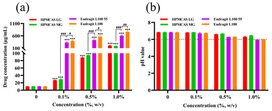 The effect of different polymers on the solubility of nintedanib is shown in Figure 3a. The addition of enteric polymers in pH 6.8 PBS buffer ranging from 0.1% to 1% (w/v) significantly increased the apparent solubility of nintedanib in a concentration–dependent manner (p < 0.001). Compared to pH 6.8 buffer without polymers, HPMCAS LG, HPMCAS MG, Eudragit L100 55, and Eudragit L100 at a concentration of 0.1% (w/v) elevated drug solubility 2.6-, 2.9-, 32.5-, and 39.0-fold, respectively. At the concentration of 0.5%, Eudragit L100 increased the drug solubility 6.4-, 6.0-, and 1.3-fold in comparison with HPMCAS LG, HPMCAS MG, and Eudragit L100 55, respectively. HPMCAS LG presented a similar increase as HPMCAS MG (p > 0.05). Eudragit L100 and L100 55 had similar potential to solubilize nintedanib, while Eudragit L100 showed stronger solubilization (p < 0.05 or p < 0.01). Compared to Eudragit L100 and L100 55, the improvement in the drug solubility was more dependent on the concentration gradient of HPMCAS LG and MG (p < 0.001). As shown in Figure 3b, the pH value of the corresponding medium slightly decreased with the additional content of polymers. However, the pH values were still around 6.0 at a 1.0% polymer concentration. These data indicated that the interaction between the enteric polymers and the drug improved the solubility of nintedanib, other than changing the pH value of the environment.