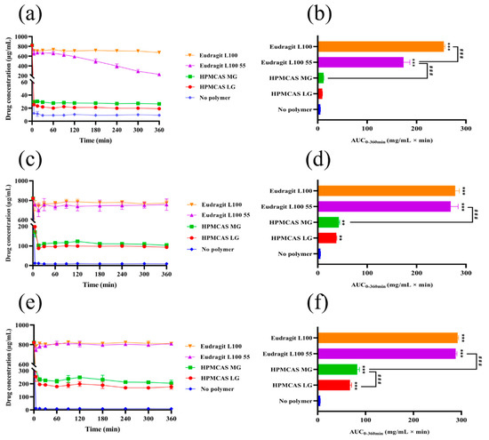 The in vitro nintedanib concentration-time profiles and their respective AUC0–360min are shown in Figure 4. Upon inducing the supersaturation of nintedanib without polymers, immediate and complete precipitation could be observed. When enteric polymers were added to pH 6.8 PBS buffer, the remaining concentration of nintedanib increased with the polymer concentration increase. The addition of HPMCAS increased the apparent solubility of nintedanib but to a lower extent (Figure 4a,b). The AUCs in the medium with over 0.5% of HPMCAS LG were statistically different from those for PBS (p < 0.01 or p < 0.001). Compared to HPMCAS LG, a marked increase in AUC in the HPMCAS MG groups at 1.0% was observed (p < 0.001). Moreover, Eudragit L100 55 at 0.1% maintained a drug concentration of approximately 650 μg/mL for up to 60 min but decreased later (Figure 4a). With the increase in the Eudragit L100 55 concentration, the ability to maintain supersaturation increased (Figure 4c,e). Among all four polymers, Eudragit L100 demonstrated the best supersaturation maintenance in PBS 6.8, reaching the highest AUC (Figure 4b,d,f). In particular, Eudragit L100 at 0.1% was able to maintain a drug concentration of circa 670 μg/mL within 360 min and obtained the highest AUC (p < 0.001). These findings suggested a certain concentration-dependent effect of the four polymers on maintaining drug supersaturation and showed that the capability of retaining supersaturation is in the order Eudragit L100 > Eudragit L100 55 > HPMCAS MG > HPMCAS LG.