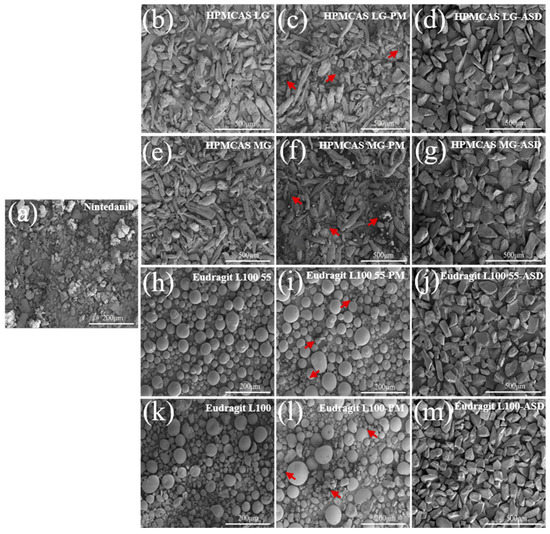SEM images of (a) nintedanib, (b) HPMCAS LG, (c) HPMCAS LG–PM, (d) HPMCAS LG–ASD, (e) HPMCAS MG, (f) HPMCAS MG–PM, (g) HPMCAS MG–ASD, (h) Eudragit L100 55, (i) Eudragit L100 55–PM, (j) Eudragit L100 55–ASD, (k) Eudragit L100, (l) Eudragit L100–PM, (m) Eudragit L100–ASD. Arrows indicate drug crystal structures.