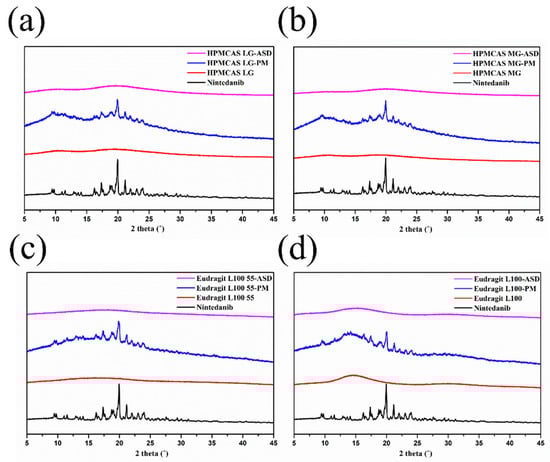 Figure 8 shows the thermal behaviors of nintedanib, polymers, physical mixtures, and ASDs. Nintedanib powder exhibited a small melting peak at 134 °C and a sharp and intense endothermic peak at 305 °C, indicating that the drug existed in a crystalline form, as previously reported [9]. The physical mixtures with HPMCAS LG or HPMCAS MG demonstrated an endothermic peak at 134 °C, whereas the endothermic peak at 305 °C disappeared, which might be attributed to the poor thermal stability of the physical mixtures as HPMCAS degraded above 250 °C [36]. The mixtures of nintedanib with Eudragit L100 55 or Eudragit L100 displayed a shift in endothermic peak to a slightly lower temperature of 300 °C, which might be due to the solvent effect of the molten polymer [37]. No endothermic peaks were detected in all ASDs, suggesting that nintedanib was miscible with the four polymers and converted from the crystalline state to an amorphous state.