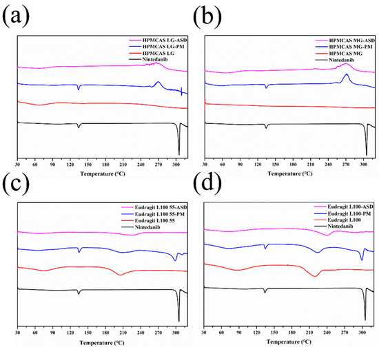 DSC curves of nintedanib and samples with (a) HPMCAS LG, (b) HPMCAS MG, (c) Eudragit L100 55, (d) Eudragit L100.