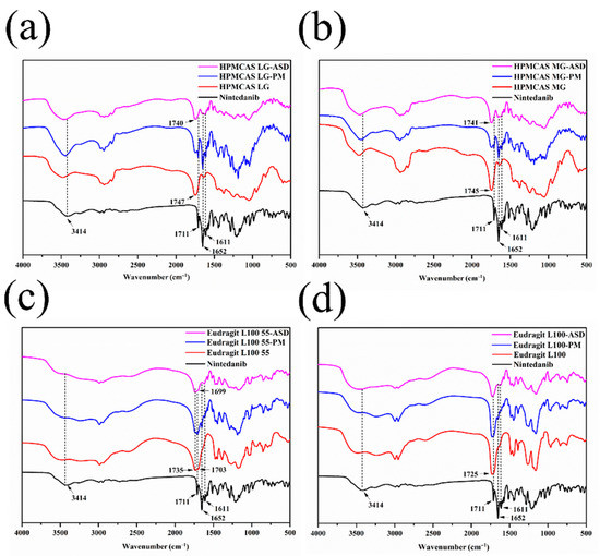FT–IR analysis was performed for the possible molecular interactions between the drug and polymers. The IR spectra of nintedanib, polymers, PMs, and ASDs are depicted in Figure 9. Characteristic peaks of nintedanib appeared at 3414 cm−1 (N–H stretch), 1711 cm−1 (C=O stretch, ester), 1652 cm−1 (C=O stretch, secondary amide), and 1611 cm−1 (C=O stretch, tertiary amide). Physical mixtures of nintedanib with HPMCAS LG, HPMCAS MG, or Eudragit L100 55 exhibited both the characteristic peaks of the drug and respective polymer, except Eudragit L100. The spectra of ASDs showed significant changes. For the ASD formulated by HPMCAS LG, the C=O stretching peak at 1711 cm−1 disappeared, and the C=O stretching (1652 cm−1 and 1611 cm−1) tended to broaden. The N–H stretching peak of nintedanib decreased significantly (Figure 9a). Moreover, the C=O stretching peak of HPMCAS LG at 1747 cm−1 shifted slightly to 1740 cm−1. The spectrum of HPMCAS MG–ASD was similar to that of HPMCAS LG–ASD, with a slight shift in the characteristic peak of the polymer from 1745 cm−1 to 1741 cm−1 (Figure 9b). These changes indicated the formation of H-bonds between the HPMCAS carbonyl group and the N–H bond in the nintedanib. In ASDs prepared with Eudragit L100 55 or Eudragit L100, the C=O stretching bands at 1711 cm−1 and 1652 cm−1 in nintedanib disappeared, along with the N–H stretching peak at 3414 cm−1. The C=O of Eudragit L100 55 (1735 cm−1) and Eudragit L100 (1725 cm−1) became weak, and the C=O stretching of Eudragit L100 55 at 1703 cm−1 blue-shifted to 1699 cm−1 (Figure 9c,d). These findings in the Eudragit–ASDs’ FT–IR spectra also suggested the H-bonding interactions between the N-H bond of nintedanib and the carbonyl group of Eudragit L100 55 or Eudragit L100. In addition, the peak at 1611 cm−1, as assigned to the stretching of C=O in the nintedanib band, weakened in Eudragit L100–ASD compared to Eudragit L100 55–ASD, implying that Eudragit L100 might provide stronger interactions with the drug. The contribution of hydrogen bonding between the drug and the enteric polymers might facilitate the inhibition of drug crystallization and precipitation [34,38].