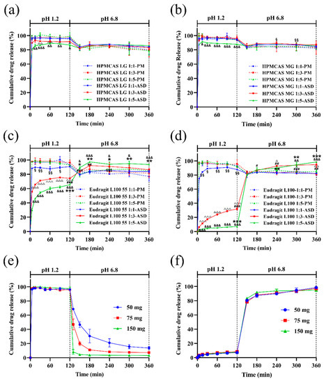 Dissolution behaviors of ASDs with different ratios of nintedanib (50 mg) and polymers were examined in SGF for 120 min and then in SIF for 240 min. As depicted in Figure 10a–d, the type and content of enteric polymer largely influenced the drug dissolution rate. For HPMCAS (both LG and MG), more than 80% and 86% of nintedanib in ASDs was dissolved in SGF at 5 min and 120 min, while more than 94% of nintedanib was dissolved for all physical mixtures. Although there was no obvious retardation with HPMCAS LG and MG in drug release in SGF, the drug release of HPMCAS LG 1:3, 1:5, and MG 1:5 ASDs presented significantly lower values than that of the corresponding ratios of physical mixtures (p < 0.05, p < 0.01, or p < 0.001). A similar observation was made by Liu et al. [39]. When the pH of the medium changed to 6.8, the dissolved concentration of the drug slightly decreased, suggesting that the released drug precipitated (Figure 10a,b). Although the precipitates continued to redissolve, the drug concentration at 240 min in SIF still was lower than in SGF. In addition, HPMCAS LG–ASDs presented similar dissolution profiles to HPMCAS MG–ASDs at the ratios of nintedanib and polymers of 1:1 and 1:5 (w/w). Interestingly, HPMCAS ASDs exhibited a superior trend to maintain the supersaturation of nintedanib in pH 6.8 PBS but without marked significance, except for HPMCAS MG–ASDs at the ratio of 1:1 (Figure 10b). These results demonstrated that HPMCAS polymers inhibited the precipitation of weakly alkaline nintedanib due to the interaction of the drug and the polymers instead of the formation of ASDs, which coincides with a previous report [36].
