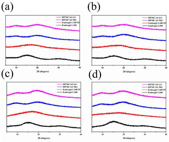 PXRD of ASDs at 92.5% ± 5% humidity and 60 °C ± 1 °C temperature. (a) 5 days (humidity), (b) 10 days (humidity), (c) 5 days (temperature), (d) 10 days (temperature).