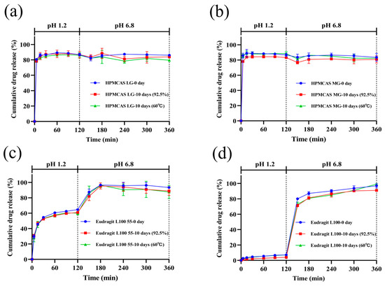 pH shift dissolution behavior of ASDs before and after being subjected to high temperature and high humidity for 10 days (mean ± SD, n = 3). (a) HPMCAS LG, (b) HPMCAS MG, (c) Eudragit L100 55, (d) Eudragit L100.