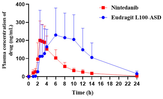 The Eudragit L100–ASD was further chosen to investigate the effect of enteric polymers on the absorption of the weakly alkaline nintedanib. The plasma concentration–time profiles and main pharmacokinetic parameters are shown in Figure 13 and Table 2, respectively. For the Eudragit L100–ASD group, the plasma concentration was not detected until 2 h. Compared to the nintedanib group (2.8 ± 0.4 h), the peak plasma concentration was achieved at 5.3 ± 2.7 h. The Tmax markedly increased (p < 0.05), indicating that Eudragit L100–ASD could resist gastric acid and delay the drug release in the GIT. The mean Cmax for Eudragit L100–ASD (370.0 ± 159.6 ng/mL) was 1.5–fold higher than that of nintedanib (248.3 ± 70.4 ng/mL), but the lack of marked difference (p > 0.05) might be due to the high individual variation among rats. The AUC0–24h for Eudragit L100–ASD (2710.6 ± 1479.4 ng/mL·h) was significantly greater than that obtained with nintedanib (1107.6 ± 292.3 ng/mL·h) (p < 0.05), indicating that the ASD formulation significantly improved the oral bioavailability (Frel = 245%). No significant differences were observed for t1/2 values of Eudragit L100–ASD and nintedanib. However, the MRT of Eudragit L100–ASD significantly increased compared to the crystalline drug (p < 0.01), indicating that the enteric polymer extended the absorption period and provided a sustained plasma profile.