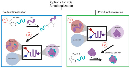 Illustration of the polyethylene glycol (PEG) conjugation methods (pre- and post-functionalization of Zein and Zein nanoparticles (NP)s, respectively) that could be utilized for PEGylation of Zein via a PEG-N-hydroxysuccinimide (NHS) ester reaction.