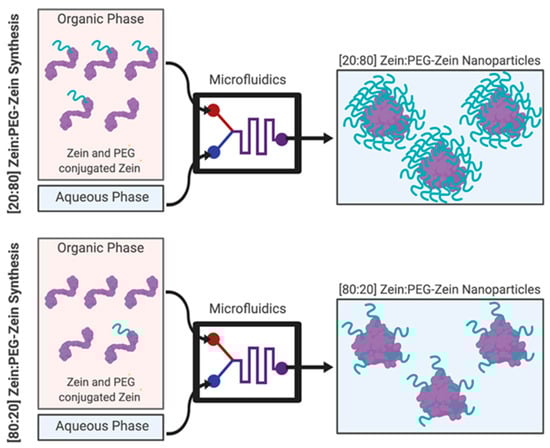Illustration of the polyethylene glycol (PEG) pre-conjugation that could be utilized for the PEGylation of Zein via a PEG-N-hydroxysuccinimide (NHS) ester reaction. Example synthesis of the [20:80] and [80:20] Zein:PEG-Zein nanoparticle formulations depicted above.
