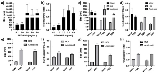 Post-functionalization of Zein nanoparticles (NPs) in varying experimental conditions: (a) size of Zein NPs at a PEG-N-hydroxysuccinimide (NHS) concentration between 0.1 and 4.0 mg/mL; (b) polydispersity of Zein NPs at a PEG-NHS concentration between 0.1 and 4.0 mg/mL; (c) size of Zein NPs post functionalized with 3.0 mg/mL PEG-NHS in an unbuffered system adjusted directly with HCl or acetic acid; (d) polydispersity of Zein NPs post-functionalized with 3.0 mg/mL PEG-NHS in an unbuffered system adjusted directly with HCl or acetic acid; (e) size of Zein NPs post-functionalized in 5% DMSO with 3.0 mg/mL PEG-NHS in an unbuffered system adjusted directly with HCl or acetic acid; (f) polydispersity of Zein NPs post-functionalized in 5% DMSO with 3.0 mg/mL PEG-NHS in an unbuffered system adjusted directly with HCl or acetic acid; (g) size of Zein NPs post-functionalized in 10% EtOH with 3.0 mg/mL PEG-NHS in an unbuffered system adjusted directly with HCl or acetic acid; and (h) polydispersity of Zein NPs post-functionalized in 10% EtOH with 3.0 mg/mL PEG-NHS in an unbuffered system adjusted directly with HCl or acetic acid.