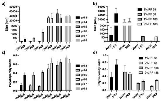 Temperature was decreased from room temperature (20 °C) to 4 °C to determine if the rate of aggregation could be decreased. The pH was adjusted using acetic acid to a pH of 3, 4, or 5. Additionally, samples were adjusted to a higher pH (a pH of 7 or 8) using NaOH directly, as weak bases could not be utilized due to the conjugation reaction used in the synthesis. As seen in Figure 5a,c, all formulations using these variations displayed an increase in size and PD when exposed to PBS. As anticipated, Zein NPs that were at their original pH (pH 6) or adjusted to higher pH levels near the protein’s isoelectric points aggregated when post-functionalized. The final synthesis parameter investigated was the addition of surfactants. In this case, all samples were synthesized as described in Section 2.3; however, the samples’ aqueous phases were modified with the addition of 0.5% Tween 80 and varying percentages of Pluronic (PF) 68 or 188 (Figure 5b,d) in a method described previously by our lab [18]. During the conjugation reaction, the solution was kept at 4 °C and the pH was not adjusted, while all other variables remained constant. It can be seen from Figure 5b,d that the formulations utilizing lower molecular weight PF formulations led to aggregation, even before the introduction of PBS. Higher molecular weight PF formulations, however, formed stable particles until PBS was introduced to the sample.