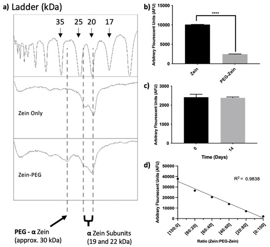 Pre-functionalization of polyethylene glycol (PEG) to Zein. (a) Densitometry of an SDS-PAGE displaying the emergence of a peak at 33 kDa, representing PEG-conjugated Zein; (b) fluorescent intensity of fluorescamine, reacting with the free primary amines on Zein, demonstrating a decrease in available primary amines once Zein is conjugated to PEG, (c) fluorescent intensity of fluorescamine for PEG-Zein at 0 and 14 days, representing the stability of the conjugation, and (d) fluorescent intensity of fluorescamine for Zein:PEG-Zein NPs at varying ratios of Zein:PEG-Zein. Statistical significance was declared at the following probability levels: **** p < 0.0001.