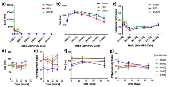 After confirmation of the PEG conjugation and NP formation, the NP formulations underwent further characterizations, including size, PD, (Figure 7a–c) and ζ potential (Figure S3). All Zein NPs synthesized with PEG-Zein exhibited a small increase in size (Figure 7a,b); the formulations had no statistically significant changes in PD when diluted in water (Figure 7c). Formulations with increasing ratios of PEG-Zein had only a minor decrease in their ζ potential (which ranged between 25 and 33 mV). The short-term stability of the various Zein NP formulations was assessed at 37 °C in DMEM. It can be observed that all formulations maintained the same size and PD for up to 72 h (Figure 7d,e). When assessing the formulations’ stability over three months at 4 °C, all formulations maintained their size and PD (Figure 7f,g). Formulations which were generated using a ratio above [80:20] Zein:PEG-Zein, e.g., containing less than 20% PEG–Zein, were identified as unstable in PBS and DMEM and, therefore, did not undergo further characterization (Figure 7a).