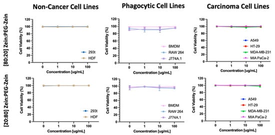 Cell viability at 72 h after [80:20] or [20:80] Zein:PEG-Zein NPs incubation at 0, 1, 10, or 100 µg/mL for non-cancer (293t and HDF), phagocytic (BMDM, RAW 264 and J774A.1) and carcinoma (A549, HT-29, MDA-MB-231, and MIA PaCa-2) cell lines.