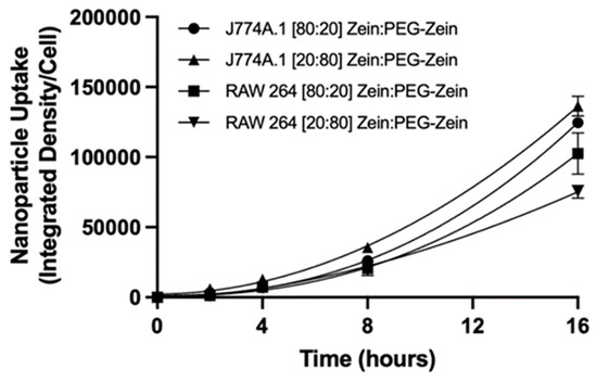 It should be noted that there was little uptake of the Zein:PEG-Zein NPs ([80:20] and [20:80] Zein:PEG-Zein NP formulations) when uptake was assessed in the non-cancer and cancer cell lines, suggesting that there was an insignificant amount of NP endocytosis (data not shown). The phagocytic cell lines (J774A.1 and RAW 264) exhibited continuous NP uptake (Figure 9) over the 16 h time course (Figures S9 and S10). J774A.1 cells were identified as having a slightly higher rate of uptake for Zein:PEG-Zein NPs at 16 h relative to RAW 264 cells, an approximately 1.2 to 1.6 fold increase. It should be noted that DiI labeled DSPC:Chol (55:45) liposome containing no PEG, which displayed similar characteristics to the Zein NPs (e.g., near neutral charge with a size of 120 ± 15 nm), demonstrated significantly higher uptake at 2 h (Figure S11). Uptake was also found to be temperature dependent for both J774A.1 and RAW 264 cell lines (Figure S12).