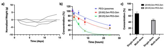 Safety and pharmacokinetic (PK) determination of Zein:PEG-Zein nanoparticles (NP)s: (a) two-week time course of weight changes in CD-1 mice dosed with 70 mg/kg of [80:20] Zein:PEG-Zein NPs; (b) PK profile of BALB/c mice dosed with 70 mg/kg of an [80:20] or [20:80] Zein:PEG-Zein NP formulation or with PEG-liposomes dosed at approximately 160 mg/kg of lipid; (c) concentration of [80:20] or [20:80] Zein:PEG-Zein NP formulations dosed at 70 mg/kg, either as a single exposure or after multiple exposures to the Zein NP formulations (e.g., the fourth and final dose of the multi-dose study).