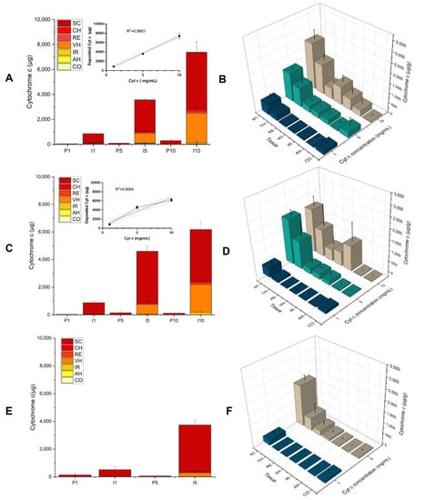 The biodistribution profiles of Cyt c in the different segments of the eye after transscleral iontophoresis at 3.5 mA/cm2 for 2 h are shown in Figure 1D. The highest concentrations of Cyt c were found in the SC. The concentrations in the VH (244 ± 98 µg/g vs. <LOD (i.e., below the LOD), p = 0.0022), RE (240 ± 212 µg/g vs. 9 ± 10 µg/g, p = 0.0043), CH (1303 ± 649 µg/g vs. 97± 64 µg/g, p = 0.0022), and SC (2119 ± 244 µg/g vs. 428 ± 43 µg/g, p = 0.0022) after iontophoresis at 5 mg/mL were significantly higher than those at 1 mg/mL. However, no statistically significant difference was found in the amounts in the deep ocular tissues upon further increasing the Cyt c concentration from 5 to 10 mg/mL, with the exception of the VH (p = 0.0043), wherein the Cyt c deposition increased from 244 ± 98 to 651 ± 192 µg/g.