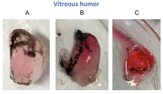 The quantitative determination of the increasing amounts of Cyt c in the vitreous humor upon increasing the Cyt c concentration in the donor compartment from 1 to 5 and 10 mg/mL could be corroborated by simple visual inspection of the red color observed in the vitreous humor after iontophoresis ((A) (1 mg/mL), (B) (5 mg/mL), and (C) (10 mg/mL)).
