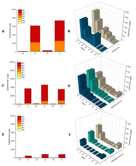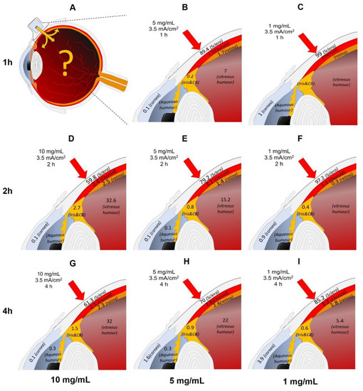 It is obvious that the first conditions studied were extreme (e.g., duration of current application of 4 h as well as a high current densities), reaching 5.5 mA/cm2, and were reported to be close to the upper limit tolerated for transscleral application in humans [8]; however, it provides a first “mapping” of the ocular biodistribution of a protein under different iontophoretic conditions. Another way to visualize the ocular biodistribution of Cyt c is presented in Figure 6, which shows the percentage of the total Cyt c delivered that is deposited in the different ocular tissues. This schematic representation of the results for Cyt c concentration in the donor compartment (increasing from right to left) and the time of iontophoresis application (increasing from top to bottom), enables visualization of the delivery through the different ocular layers, which can also be a useful tool for designing and optimizing the desired application conditions to target specific tissues. The greatest proportions of Cyt c were obtained in deeper tissues with the use of a 10 mg/mL Cyt c solution and 2 h of iontophoresis (Figure 6D), with the vitreous humor as a major site of Cyt c deposition (~30%). Moreover, iontophoresis at the shortest application time (1 h) and lower concentration (5 mg/mL) resulted in appreciable deposition in the RE and VH (Figure 6B).